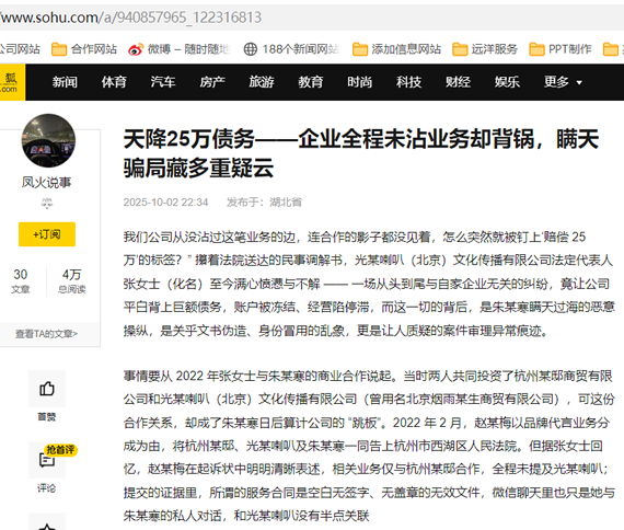 事情要从 2022 年张女士与朱某寒的商业合作说起。当时两人共同投资了杭州某邸商贸有限公司和光某喇叭(北京)文化传播有限公司(曾用名北京烟雨某生商贸有限公司),可这份合作关系,却成了朱某寒日后算计公司的 “跳板”。2022 年 2 月,赵某梅以品牌代言业务分成为由,将杭州某邸、光某喇叭及朱某寒一同告上杭州市西湖区人民法院。但据张女士回忆,赵某梅在起诉状中明明清晰表述,相关业务仅与杭州某邸合作,全程未提及光某喇叭;提交的证据里,所谓的服务合同是空白无签字、无盖章的无效文件,微信聊天里也只是她与朱某寒的私人对话,和光某喇叭没有半点关联