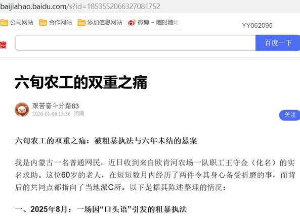 我是内蒙古一名普通网民,近日收到来自欧肯河农场一队职工王守金(化名)的实名求助。这位60岁的老人,在短短数月内经历了两件令其身心备受折磨的事,而背后的共同点都指向了当地派C所。以下是据其陈述整理的情况: